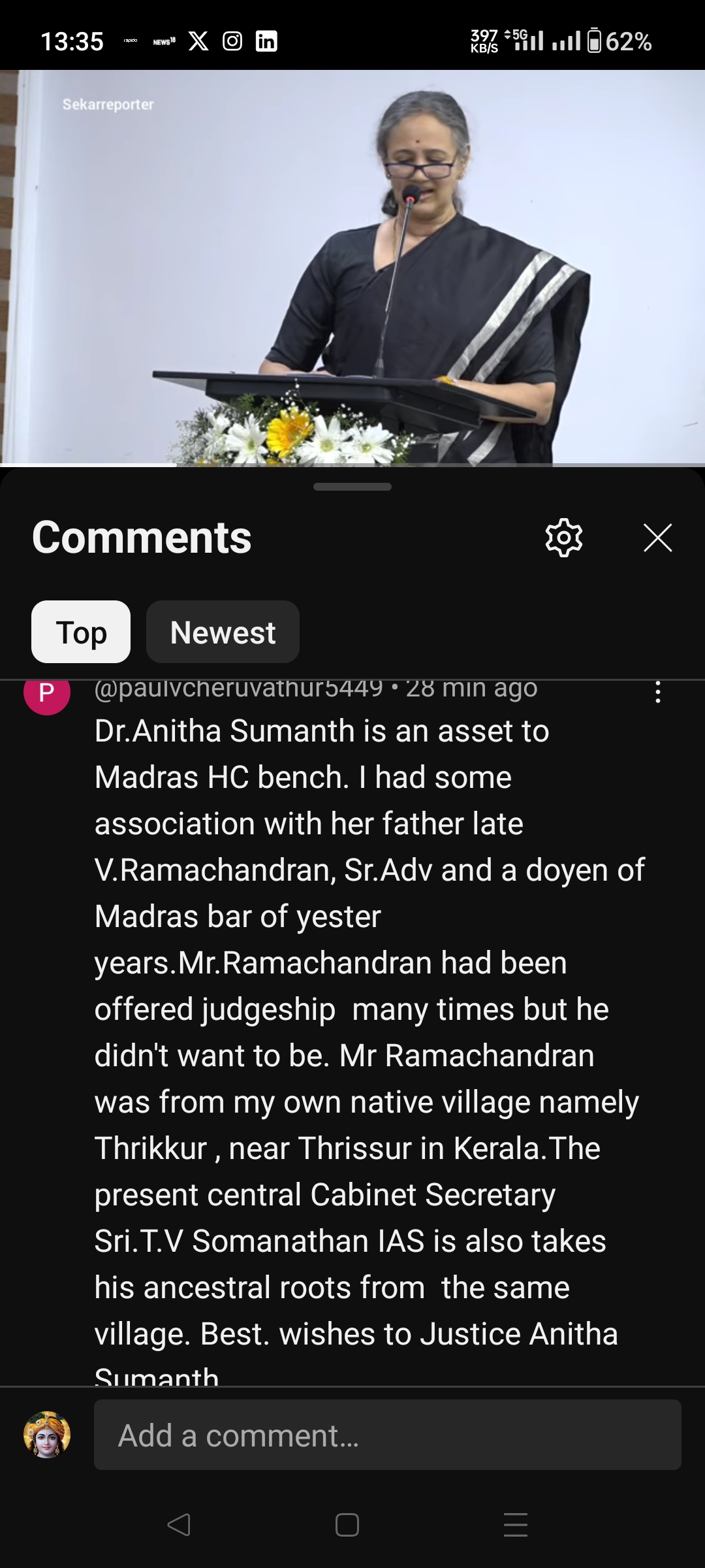 Dr.Anitha Sumanth is an asset to Madras HC bench. I had some association with her father late V.Ramachandran, Sr.Adv and a doyen of Madras bar of yester years.Mr.Ramachandran had been offered judgeship many times but he didn’t want to be. Mr Ramachandran was from my own native village namely Thrikkur, near Thrissur